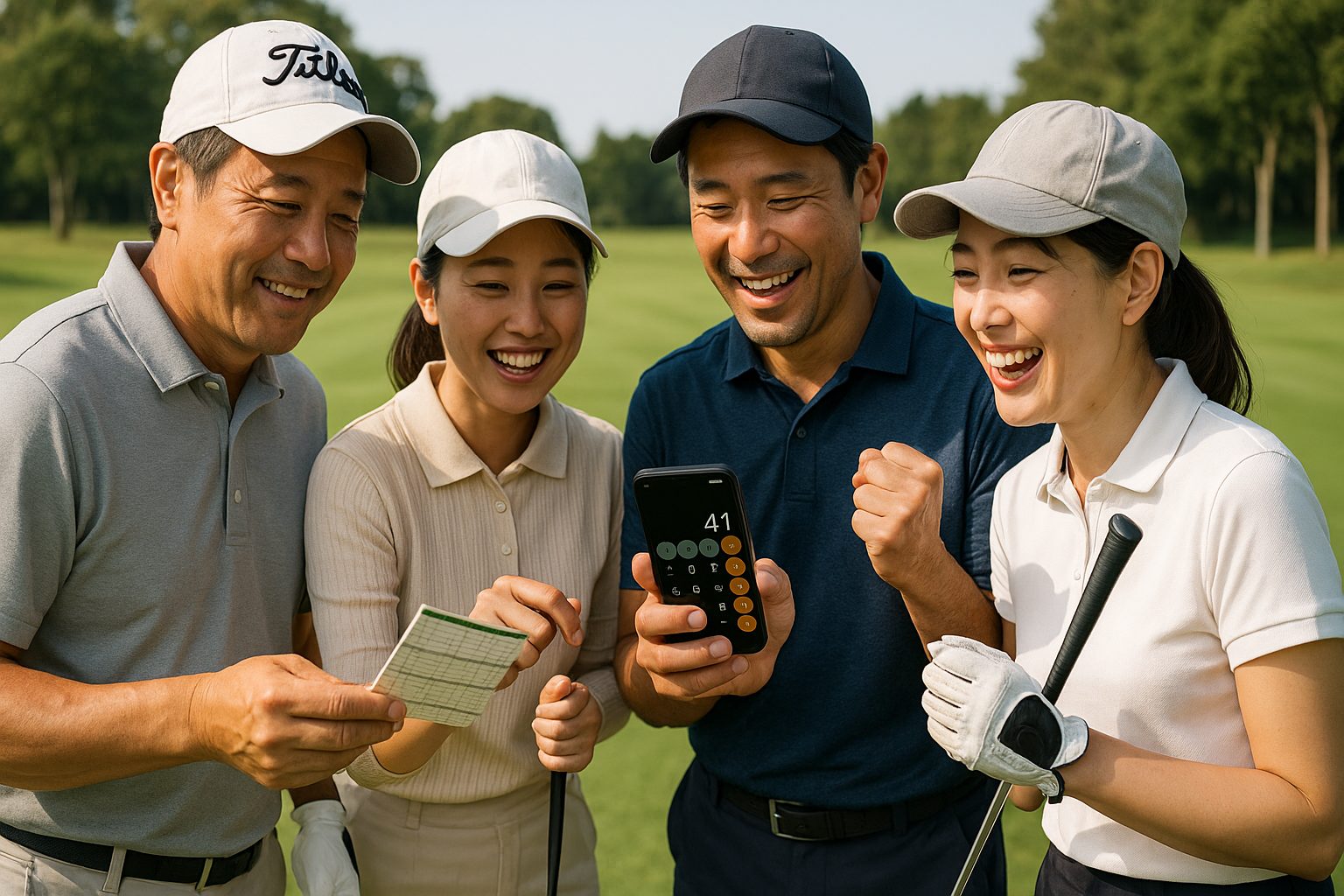 ゴルフ場で楽しくラウンドする4人の日本人ゴルファー。スコアカードと電卓を囲んで盛り上がる様子で盛り上がりを作るために採用されることが多く、仲間同士のラウンドでも「いつもと違う楽しみ方をしたい」というときに選ばれています。
