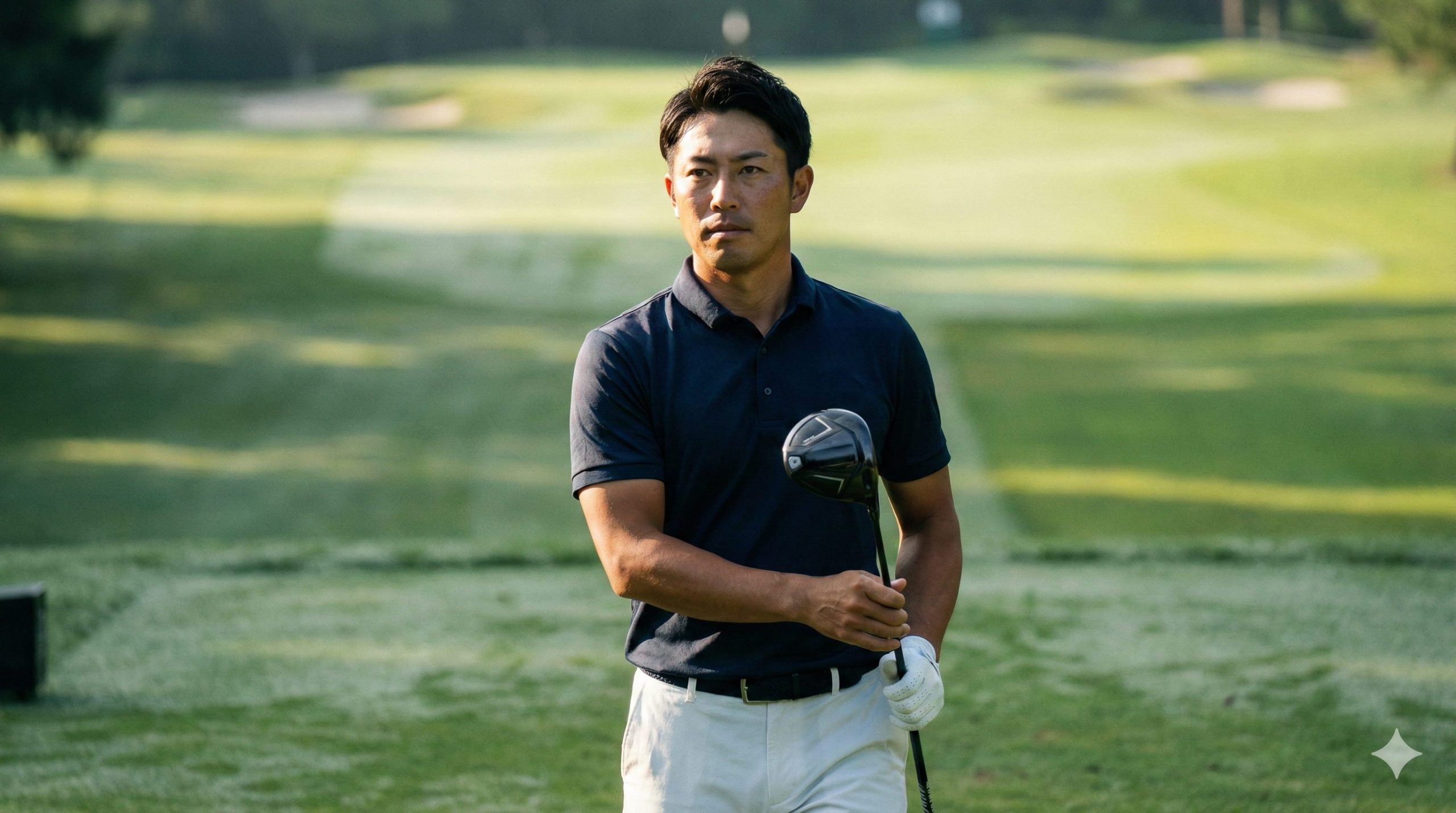 30代の日本人男性ゴルファーが、競技会のティーグラウンドで自信を持ってドライバーを構えている様子。朝日を浴び、真剣な眼差しでフェアウェイを見つめる。